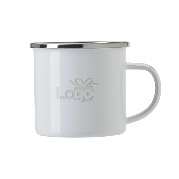 Geglazuurde mok (350 ml) met roestvrijstalen rand. Individueel verpakt in kartonnen doos. Dit product is niet vaatwasserbestendig.
