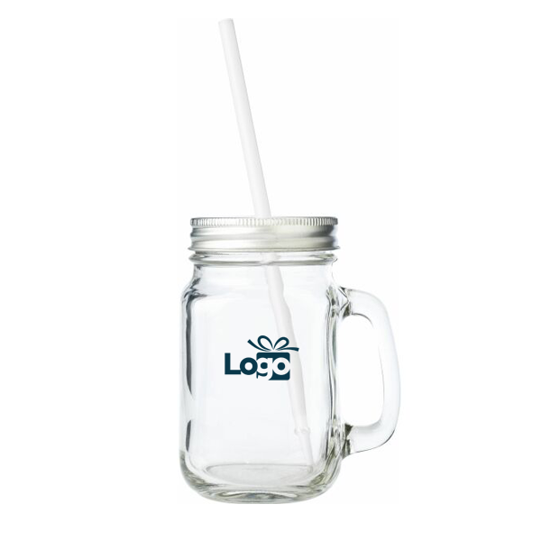 Glazen mason jar (480 ml) met zilverkleurige deksel met uitsparing en kunststof rietje. Prijs per stuk, afname per 32 stuks.