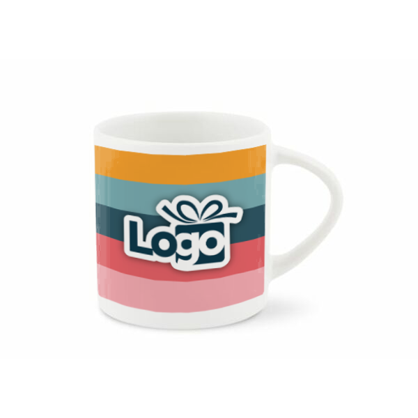 Kleine aardewerk mok. Middels sublimatie druktechniek rondom in zelfs fotokwaliteit te bedrukken. Geschikt voor alle koffie automaten.