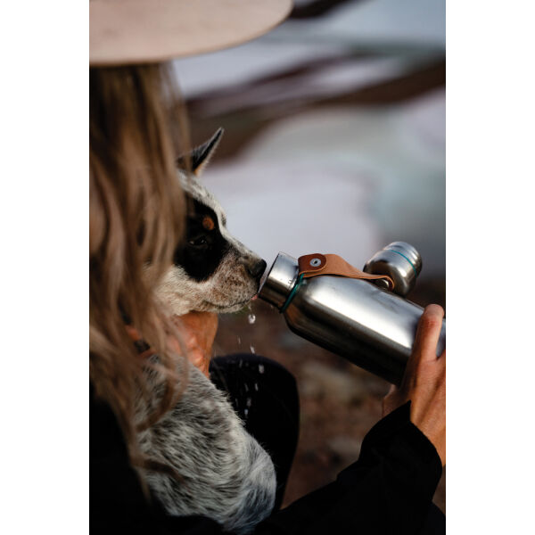 De roestvrijstalen geïsoleerde waterfles is een slanke, vacuümverzegelde fles die drankjes 24 uur koud of 12 uur warm houdt. Ook de deksel is volledig van roestvrij staal, waardoor het water niet in contact komt met plastic. Het kunstleer fungeert als draaglus en is tevens een mooi designdetail.