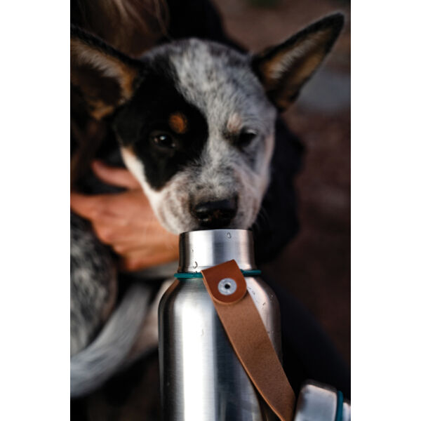 De roestvrijstalen geïsoleerde waterfles is een slanke, vacuümverzegelde fles die drankjes 24 uur koud of 12 uur warm houdt. Ook de deksel is volledig van roestvrij staal, waardoor het water niet in contact komt met plastic. Het kunstleer fungeert als draaglus en is tevens een mooi designdetail.