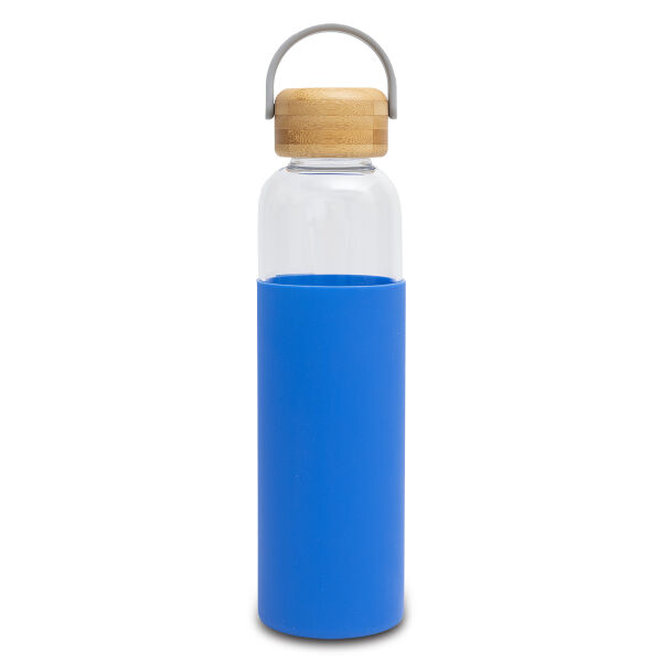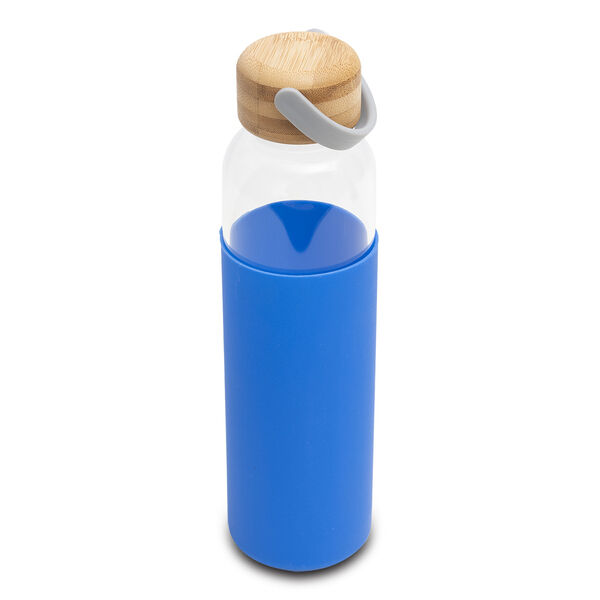 Fles van borosilicaatglas. Voorzien van een lekvrije bamboe dop met een draagriem en een soepele siliconen hoes. Ideaal voor het meenemen van je favoriete drankje, vers sap of koud water.
