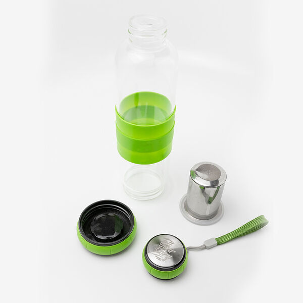 Borosilicaatglazen fles met thee-ei. Wordt geleverd met siliconen hoes en draagriem. Een geweldige fles voor je favoriete thee.