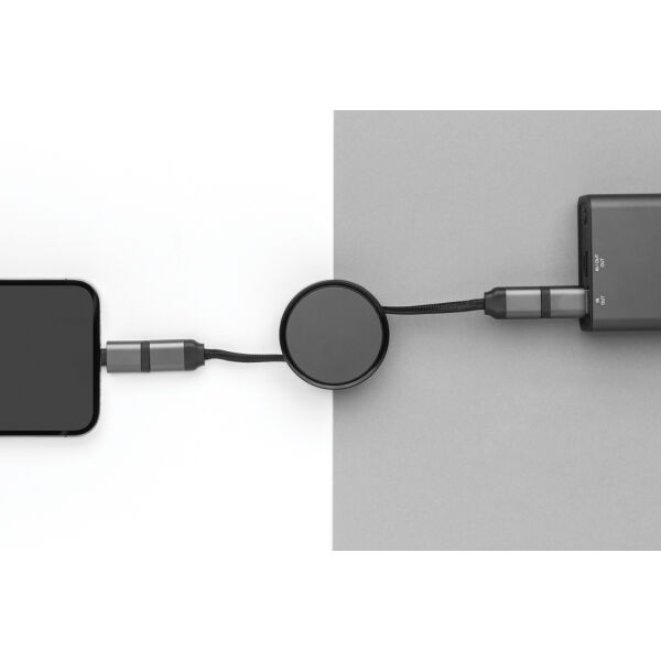 Uittrekbare oplaad- en datakabel gemaakt van RCS (Recycled Claim Standard) gecertificeerd gerecycled aluminium, gerecycled TPE en gerecycled PET. Totale gerecyclede inhoud: 68% op basis van het totale gewicht van het artikel. RCS-certificering zorgt voor een volledig gecertificeerde toeleveringsketen van de gerecyclede materialen. Aluminium verliest zijn eigenschappen niet in het recycleproces en kan eindeloos worden gerecycled. Met dubbele invoeraansluiting: USB A en type-C. Drievoudige uitvoer: Apple Lightning/Micro en Type C, in totaal 6 oplaadmogelijkheden. Met RCS-gecertificeerde gevlochten gerecyclede PET-kabels met een lengte van 100 cm wanneer volledig uitgerekt. Verpakt in FSC® mix verpakking. Geschikt voor opladen, synchroniseren en compatibel met carplay. Ondersteunt snel opladen tot 60W.