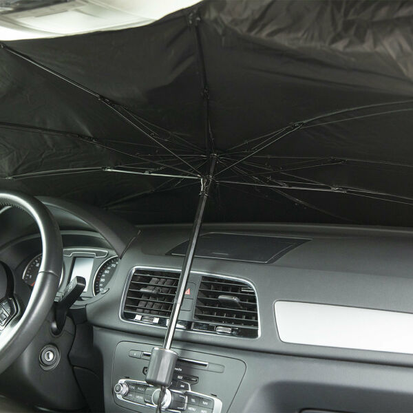 Opvouwbaar auto zonnescherm. Afmeting 140x78cm. Met manueel openingsmechanisme en polyester zakje inbegrepen.