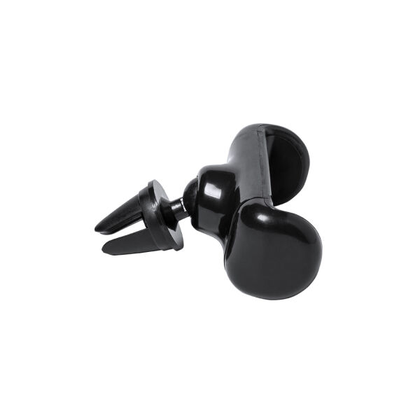 Verstelbare smartphonehouder met een minimalistisch design, 360º draaibare voet en elegante zwarte afwerking. Met bevestigingssysteem voor het ventilatierooster van de auto en breed markeeroppervlak, speciaal ontworpen voor tampondruk.