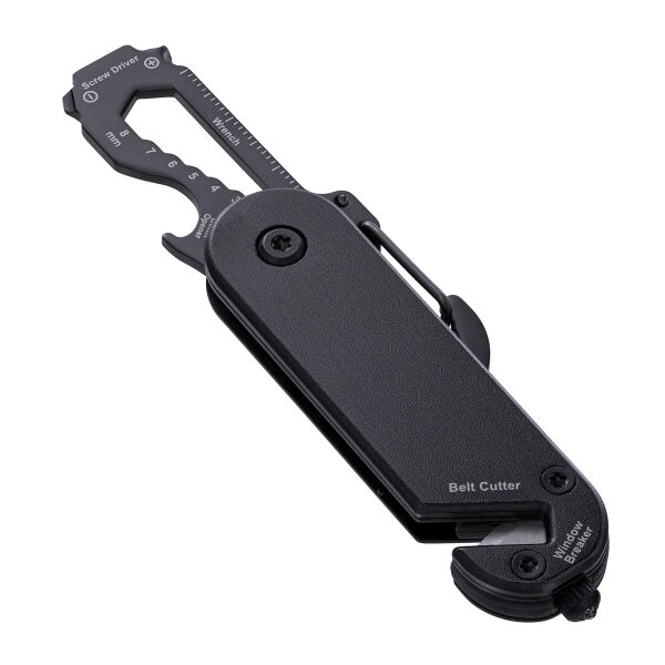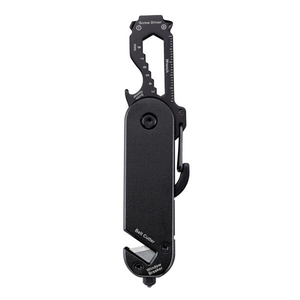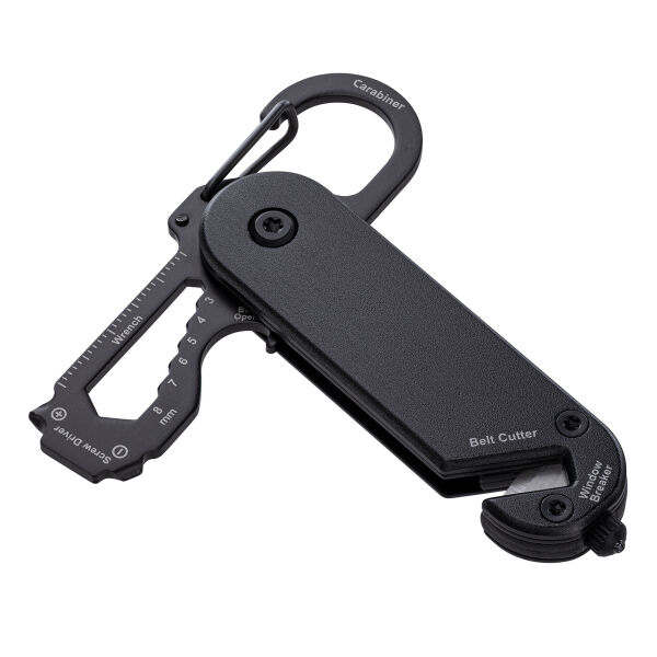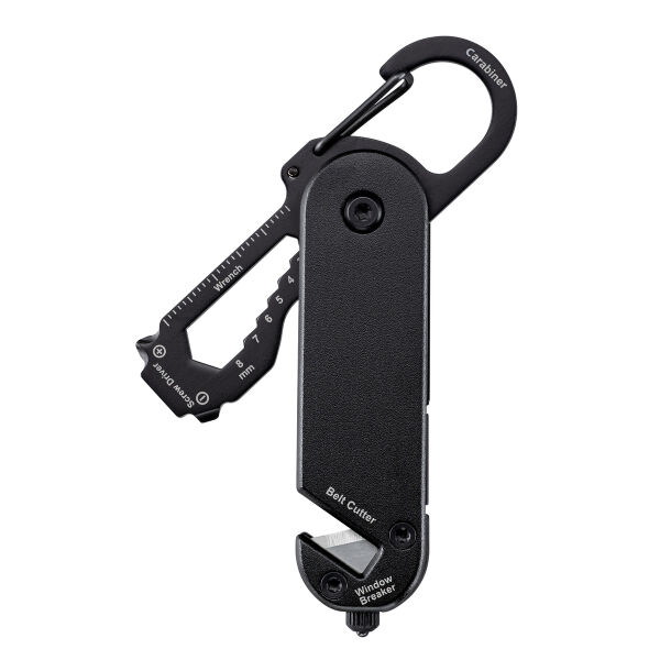 Dankzij de karabijnhaakfunctie kan het gereedschap gemakkelijk aan een rugzak, riemlus of tas worden bevestigd en is het altijd binnen handbereik. Een geïntegreerde flesopener maakt het geheel compleet.