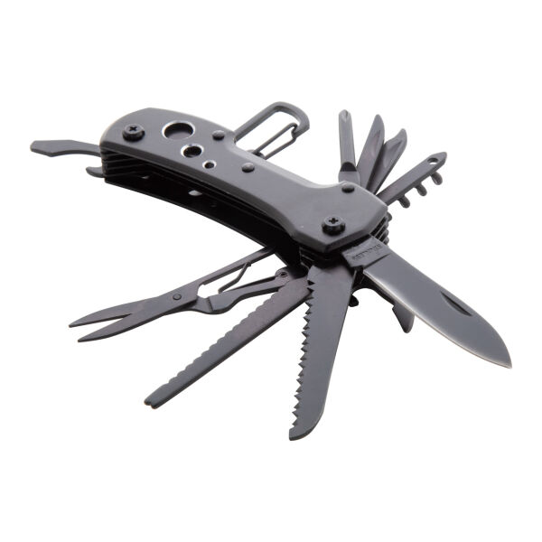 Geheel zwart roestvrijstalen zakmes met 13 functies, karabijnhaak en aluminium handvat.
