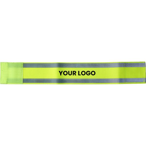 Veiligheidsarmband met twee reflecterende strepen, voor promotioneel gebruik. De reflectieve strepen zijn 1 cm wijd. De band is 32,5 cm lang en sluit met klittenband.