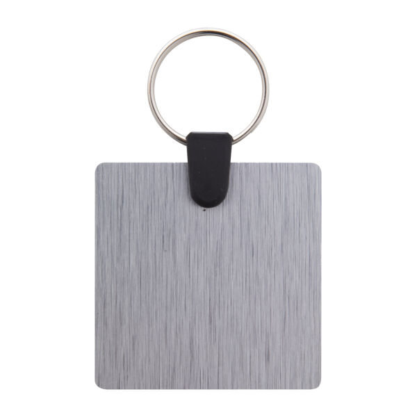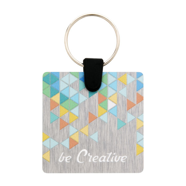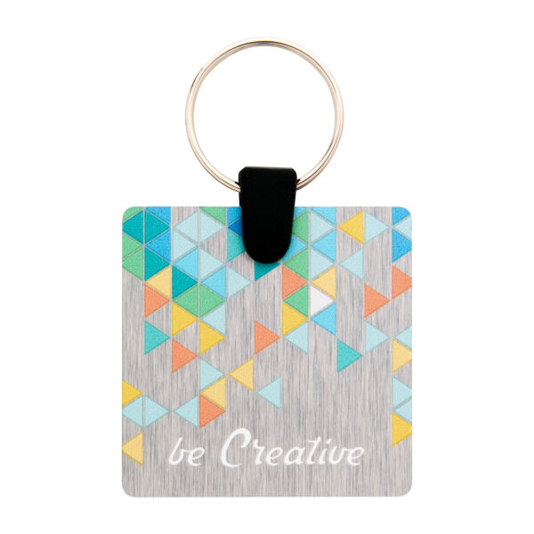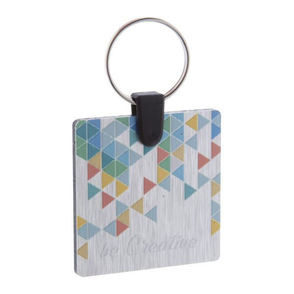 Vierkante sleutelhanger van geborsteld aluminium composiet met full colour bedrukking. Prijs is inclusief UV LED bedrukking aan één zijde. MOQ: 100 stuks.