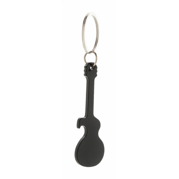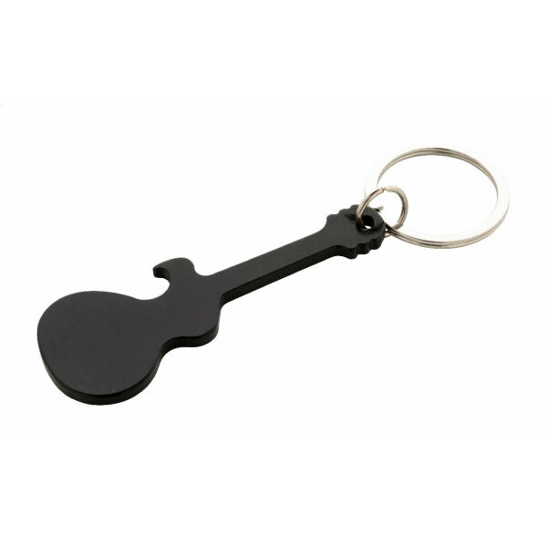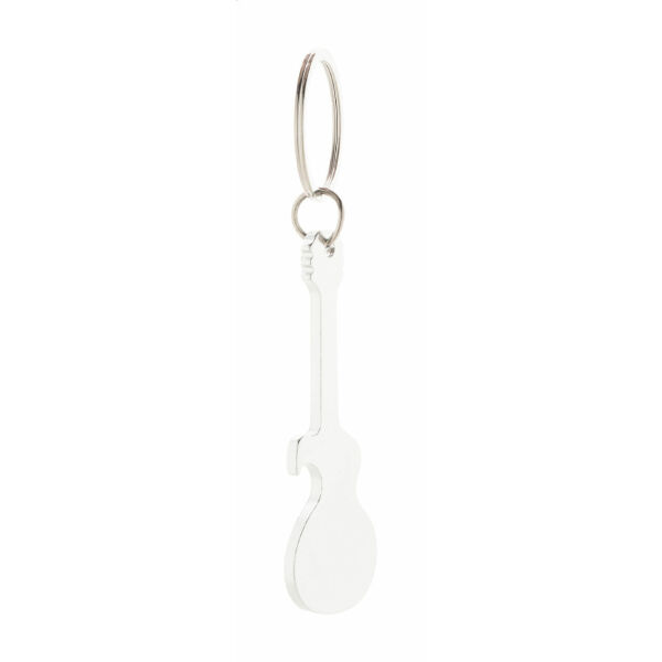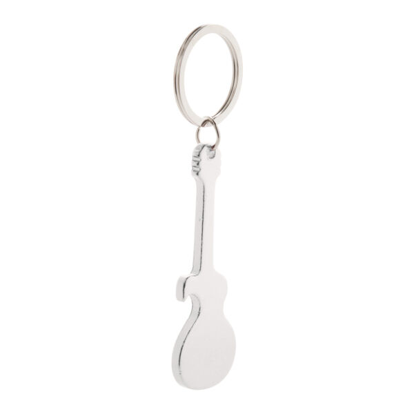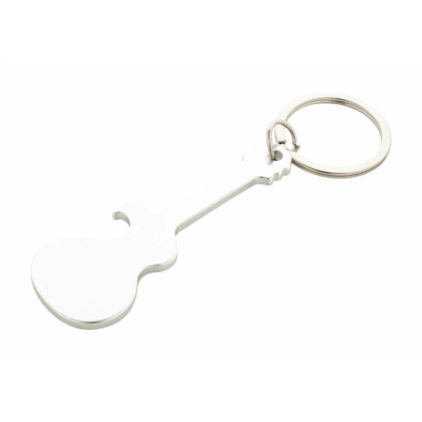 Aluminium sleutelhanger in de vorm van een gitaar. Tevens flesopener.