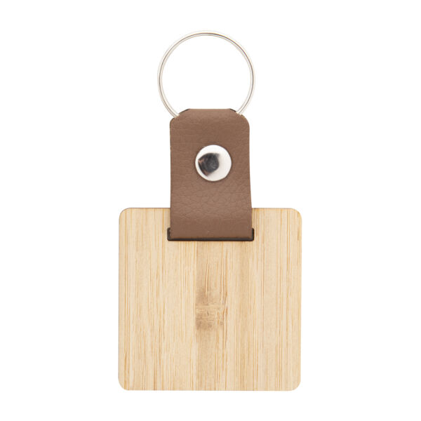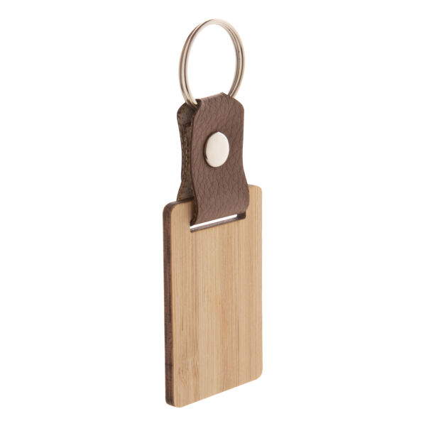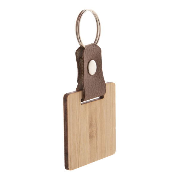 Sleutelhanger van bamboe multiplex en PU-leer met metalen ring.