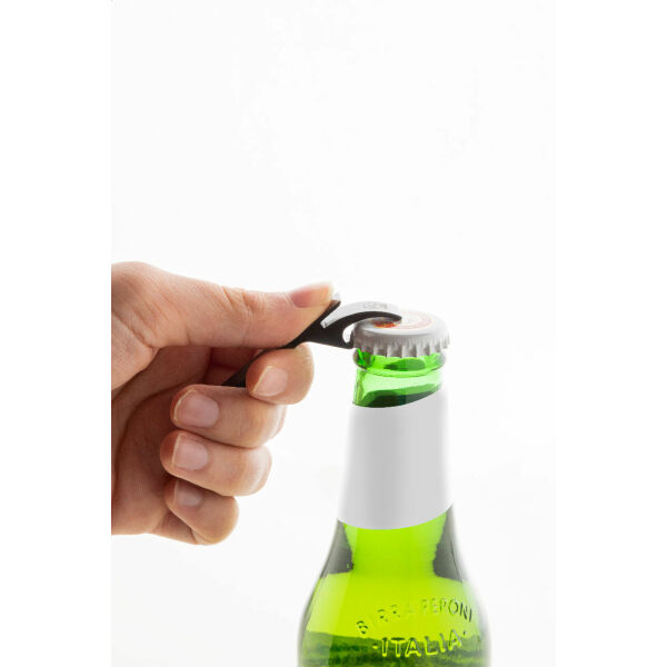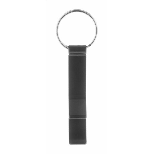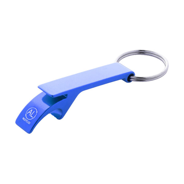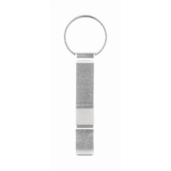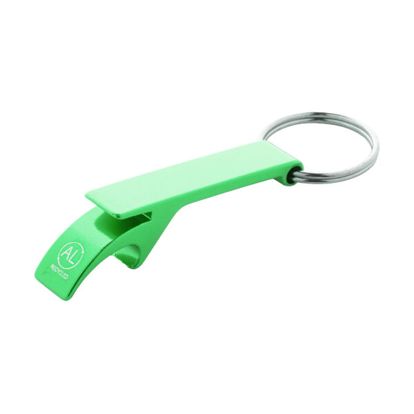 Fles- en blikopener van gerecycled aluminium met metalen sleutelhanger.
